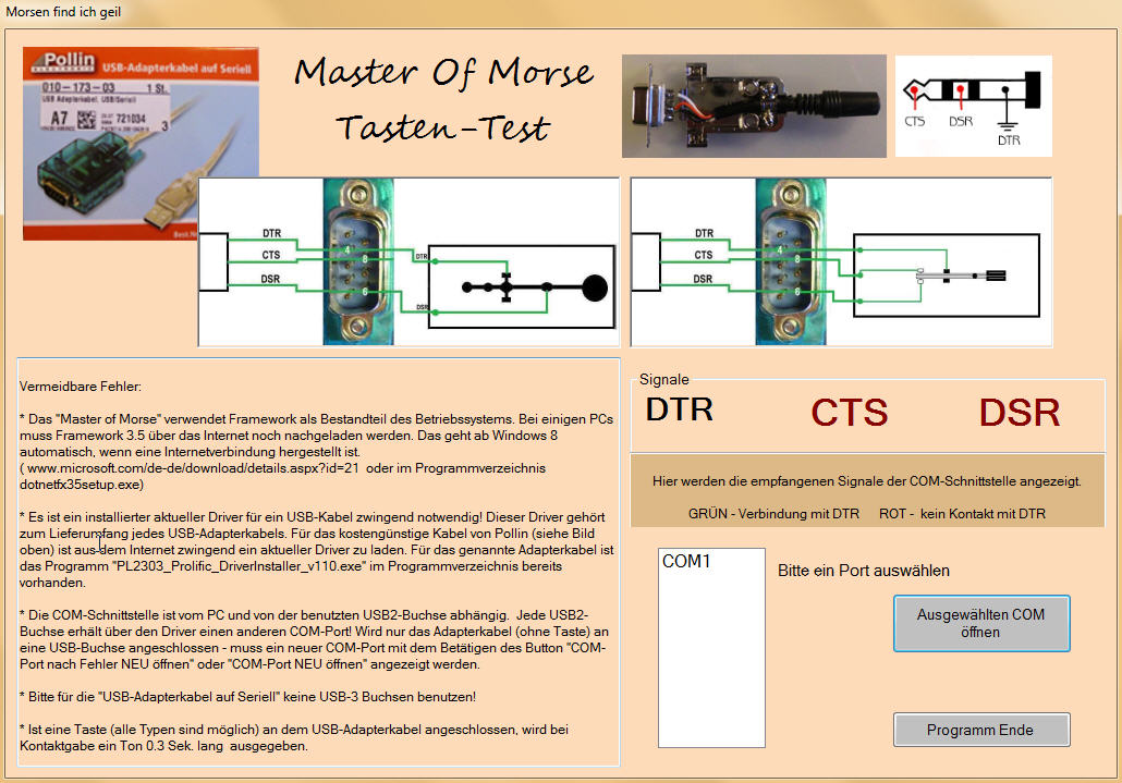 Beim Anschluss der Morsetaste an einen PC hilft das Programm "MoM Testprogramm.exe " im Programm-Ordner "Master of Morse".
